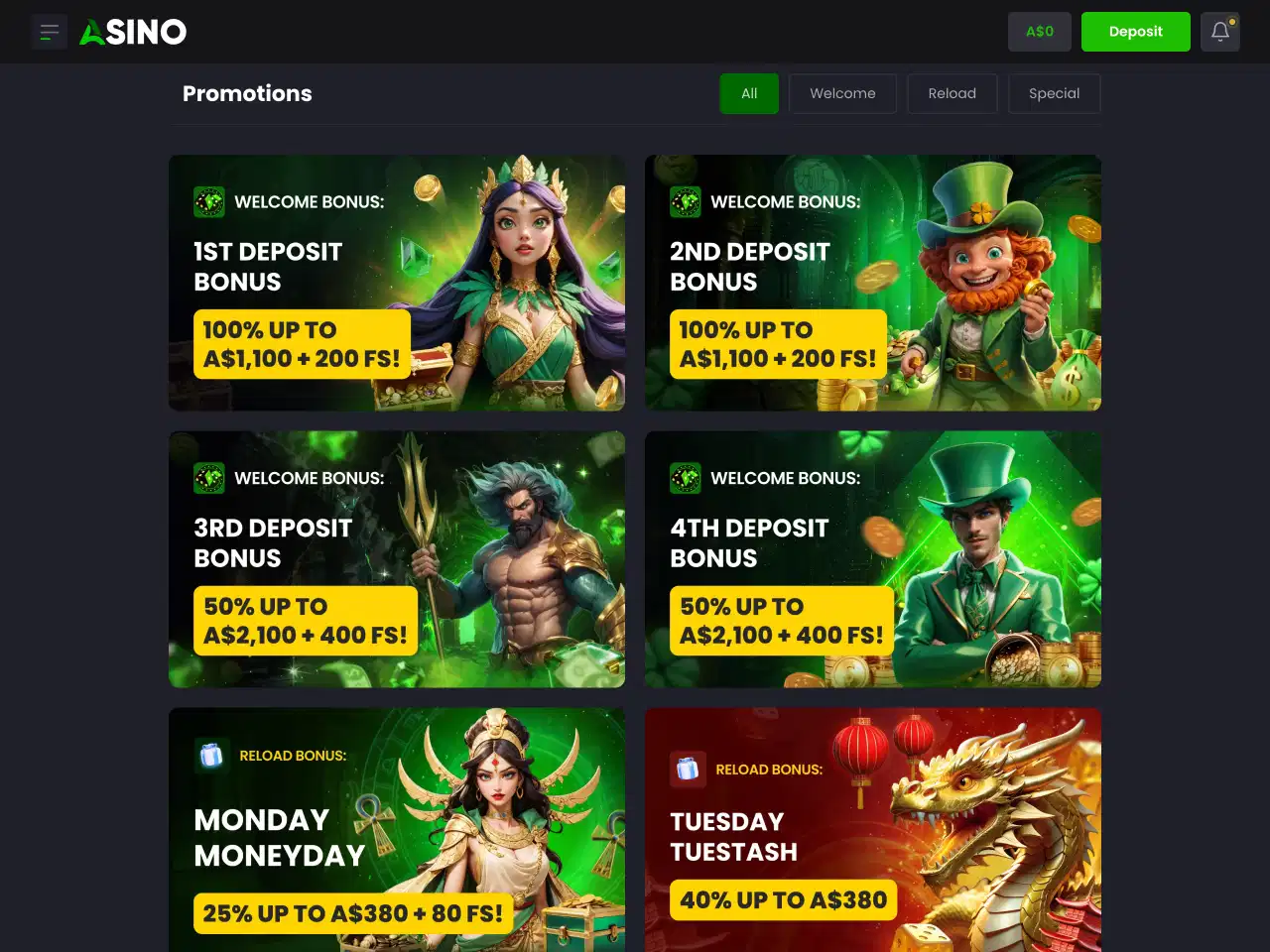 Asino Casino offers a variety of promotions to enhance players' gaming experience. New players can enjoy a welcome package of up to $6,300 and 600 Free Spins. For existing players, reload offers are available daily, providing either free spins or cash rewards depending on the day. Additionally, the casino features special promotions for various occasions. For example, players can receive a birthday bonus, which varies according to their loyalty level. Other limited-time offers, such as holiday promos and high-roller rewards, are also available, tailored to different loyalty tiers. Most promotions come with a wagering requirement of x40.