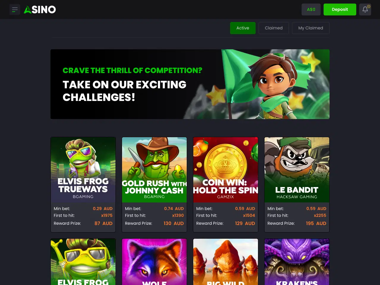 Asino offers a loyalty program that includes personalised perks for dedicated players. You can advance through 100 loyalty levels across five statuses: Rookie, Challenger, Elite, Champion, and Titan, earning rewards such as free spins and cash bonuses as they progress. To climb the loyalty ladder, you need to accumulate loyalty points by playing the casino games. For every $30 bet, a player gets one point. However, these loyalty points cannot be exchanged for more promos or benefits, which is not a direct disadvantage, but still, many players could appreciate such an ability. High-level players are also invited to the VIP club, where they receive a personal manager and enjoy benefits like faster payouts, individual bonuses, and exclusive access to special tournaments.