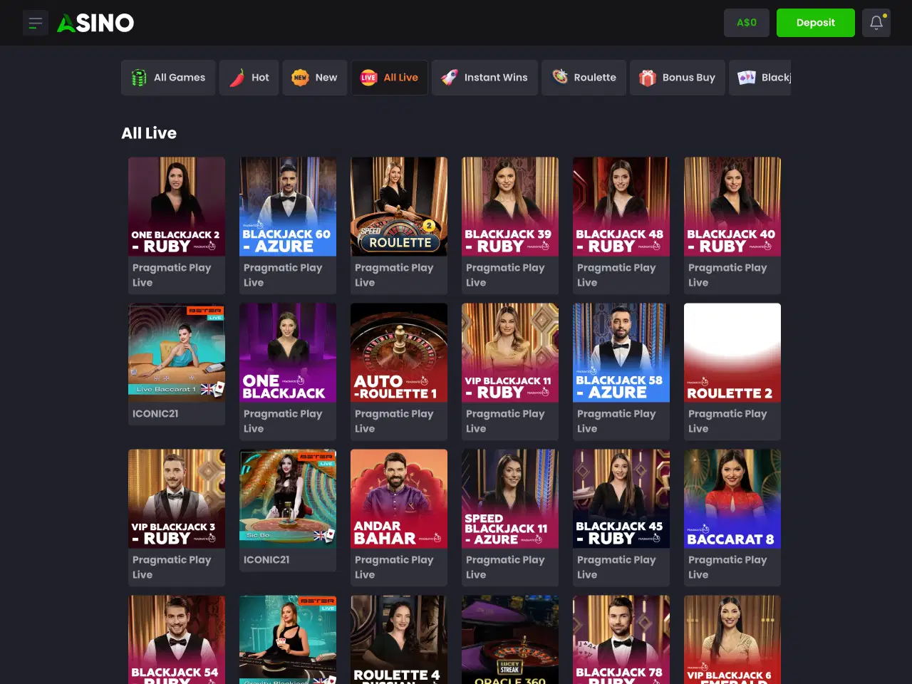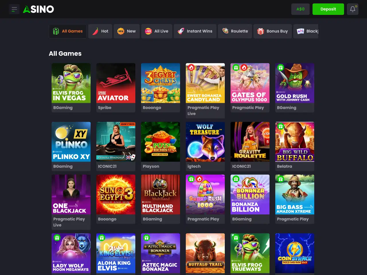 Asino offers a large selection of games, with over 11,000 titles and more than 500 live games. There are multiple pokie types, e.g. classic titles, pokies with Bonus Buy, Megaways, and other features. The selection of live games includes roulette, baccarat, blackjack, game shows, etc. The games are well-organised by categories such as Hot, New, Live Games, Instant Win, and more.
