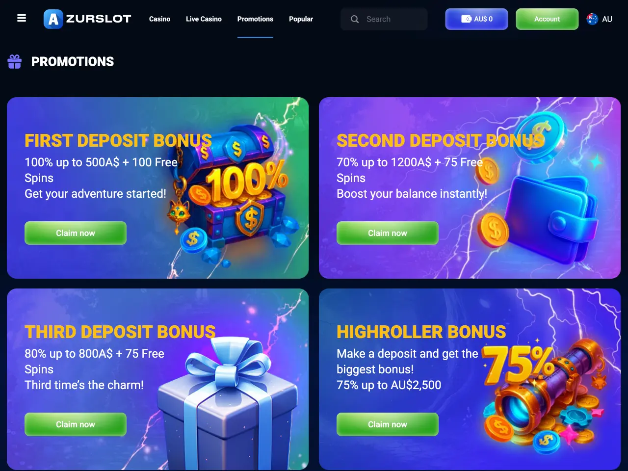Launched in 2025, AzurSlot Casino is a new online gaming site catering to Aussie players with a robust selection of pokies, table games, and live dealer content. One standout feature is its use of promo codes shared via social media, which keeps bonuses fresh and event-driven. A built-in Achievements System lets players earn comp coins for hitting milestones, which can be redeemed in the Bonus Shop for free spins or bonus cash. The platform also runs a tiered Loyalty Program and an exclusive, invite-only VIP club, designed to reward ongoing activity with added benefits.