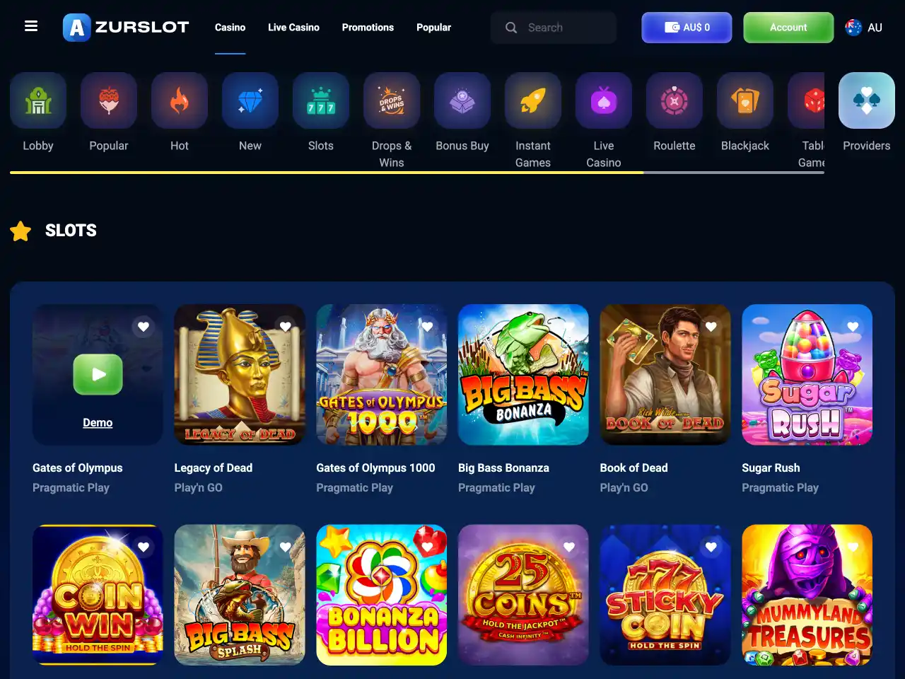 AzurSlot hosts games from a broad range of software providers, including Play’n GO, Pragmatic Play, NetEnt, Microgaming, and others. Each game tile displays the developer’s name beneath the title. The casino interface supports provider-based filtering, allowing users to browse games by studio. Load times are consistent across titles. Both HTML5 and older formats are supported, depending on the game. Providers contribute to categories like Bonus Buys, Drops & Wins, and Live Casino.
