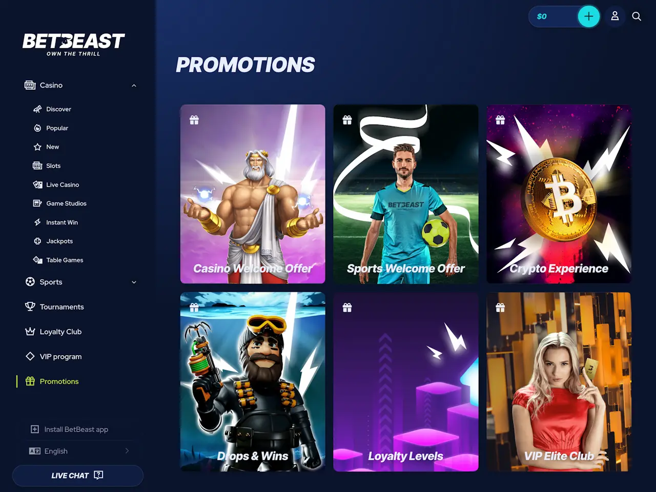 BetBeast Casino features a sleek, high-energy design with a black background and electric blue accents. The main page greets players with rotating banners advertising the latest promotions, including welcome packages, free spins, and cashback deals. The layout is intuitive, and users can explore trending pokies and card games directly from the homepage. Categories such as Popular, New, Megaways, Jackpot, Table Games, and Live Casino make browsing seamless. A sticky side menu provides quick access to sections like Games, Promotions, VIP Club, and Support, including live chat. Key information, such as bonus policies and responsible gambling guidelines, can be accessed by scrolling to the footer.