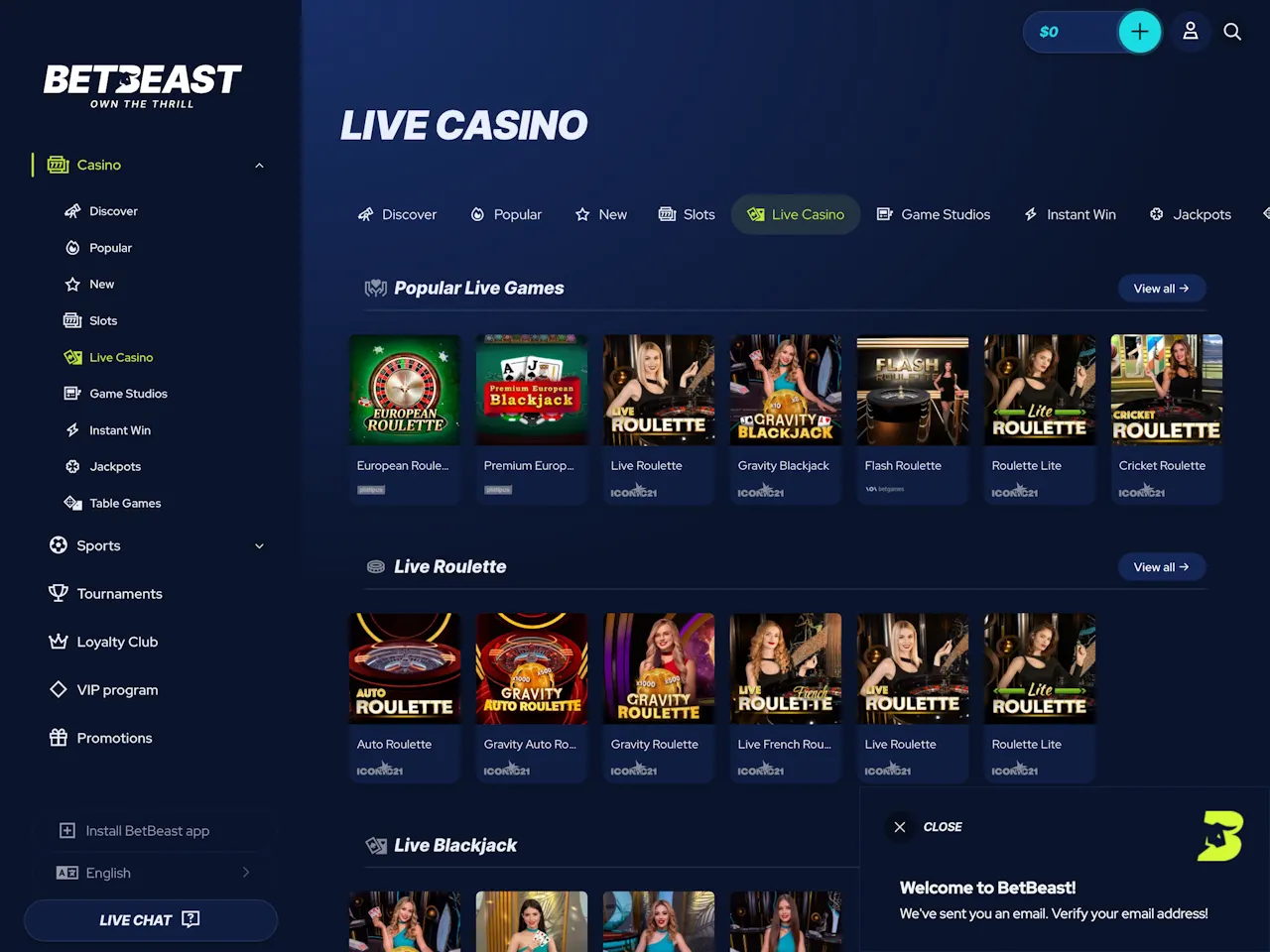 Despite a small number of games, BetBeast's game collection is not as extensive as it could be, yet it presents gamblers with a variety of pokies, table games, and over 20 live games. The casino features pokies of various types, categorising them by mechanics, such as Megaways and Hold’n Win, and popularity. The table game assortment offers blackjack, poker, roulette, baccarat, and more popular gambles. Their live-dealer titles are also available, giving players a land-based casino environment. However, you won’t find a great variety of live games there, as BetBeast features only around 20 titles.