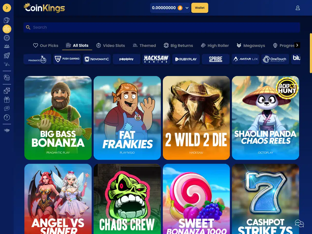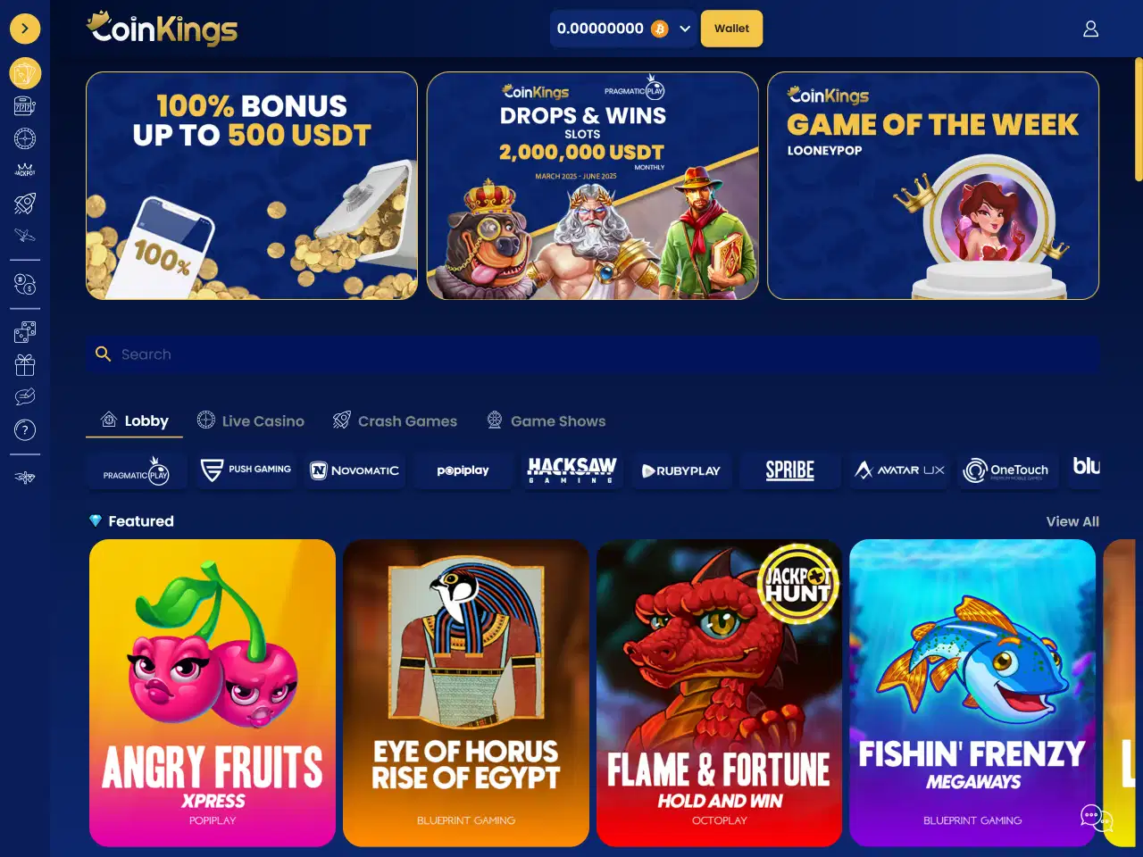 CoinKings collaborates with more than 70 providers to offer players 5,000+ games to choose from. Some of the most popular providers include Pragmatic Play, Evolution, Novomatic, RubyPlay, Spribe, Red Tiger, Evoplay, and Playson. These studios contribute the most amount of titles to this gambling platform.