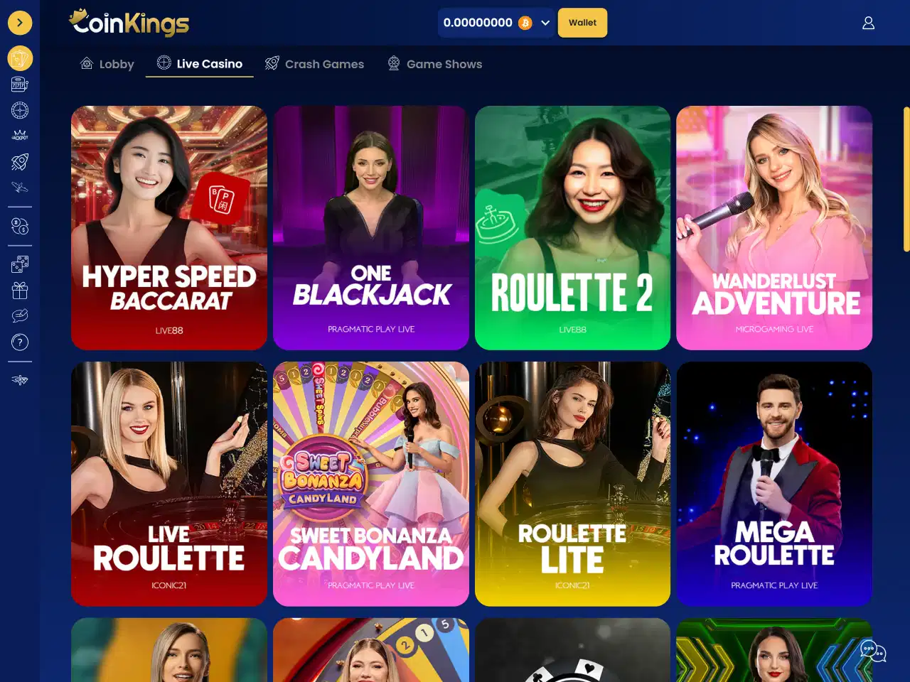 CoinKings Casino cooperates with more than 70 different studios to provide its customers with over 5,000 games to choose from. In the Live Casino section, you can find more than 40 variations of roulette, baccarat, blackjack, and more. You can also play pokies, crash games, Bonus Buys, Megaways, jackpots, and many other standard games. In addition to that, every Friday, you can enjoy six attempts at the roulette game that can bring up to 100 USDT and 500 FS. Moreover, CoinKings offers game shows, which you can watch if you click on the section with the same name. Unfortunately, games at CoinKings Casino don’t have a demo mode, so you can’t try them out before making a deposit.