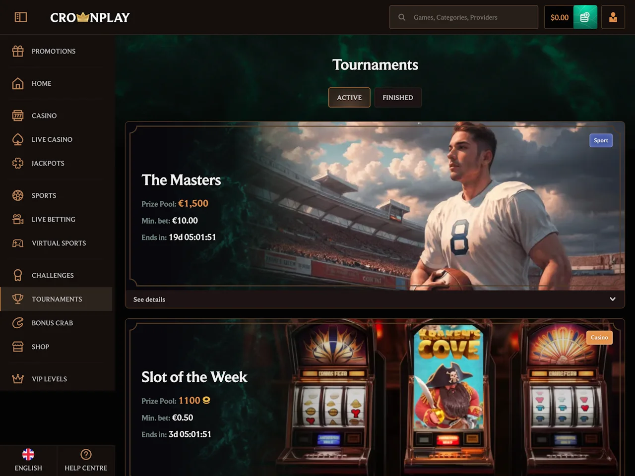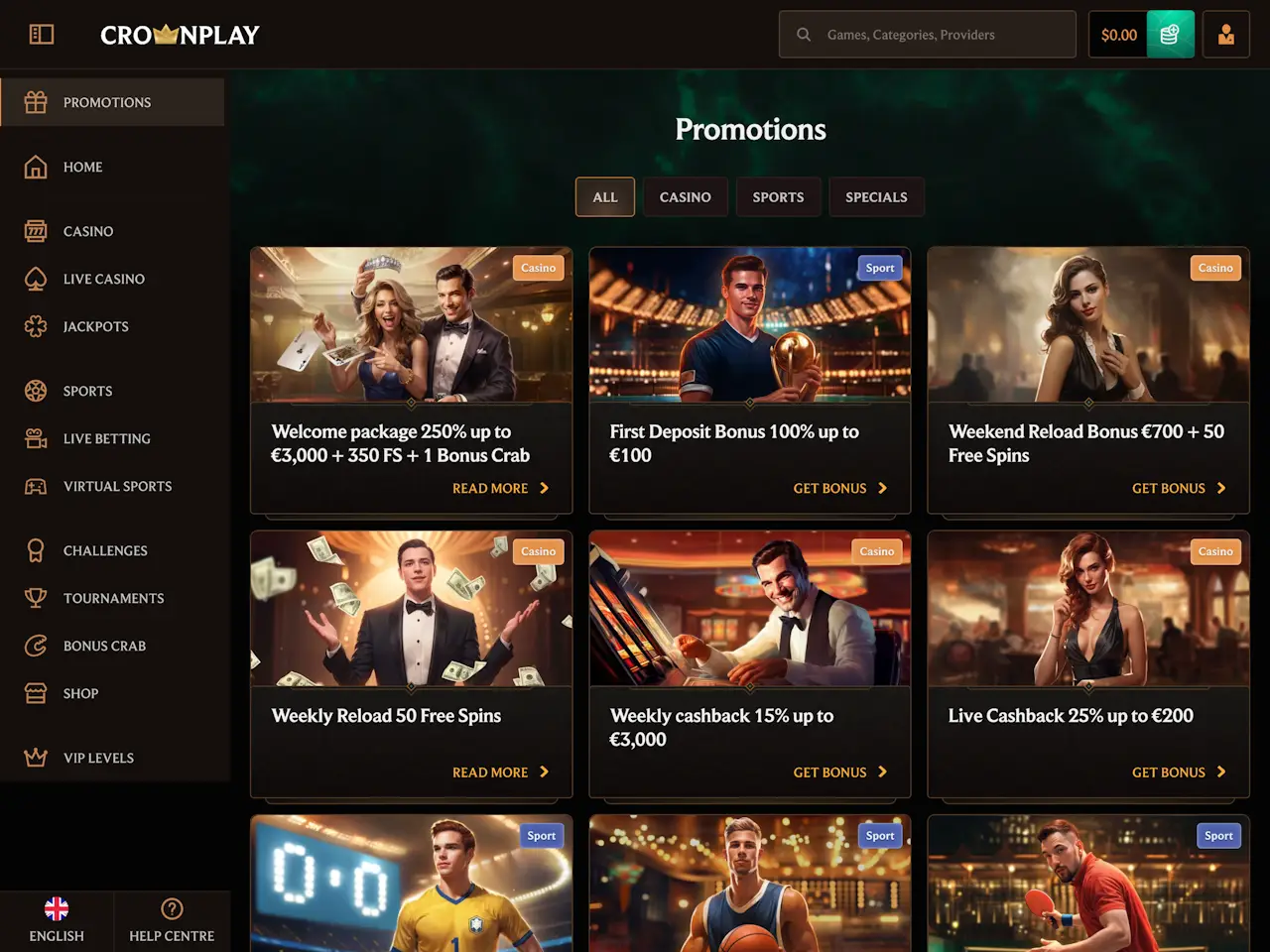 CrownPlay Casino lists a variety of active bonuses, including a welcome package, that has a $30 minimum deposit and x40 wagering. Cashback offers up to 25% come with just x1 wagering, which are quite rare to find at online casinos. Reload bonuses and tournament-linked prizes are also available. However, some terms aren’t shown until after signup, which may seem inconvenient. There is also a Bonus Shop that even lets players buy spins or credits with earned coins. In addition, gamblers have access to the Bonus Crab, where they can test their fortune and win more prizes. The mix of offers is wide and well-documented.