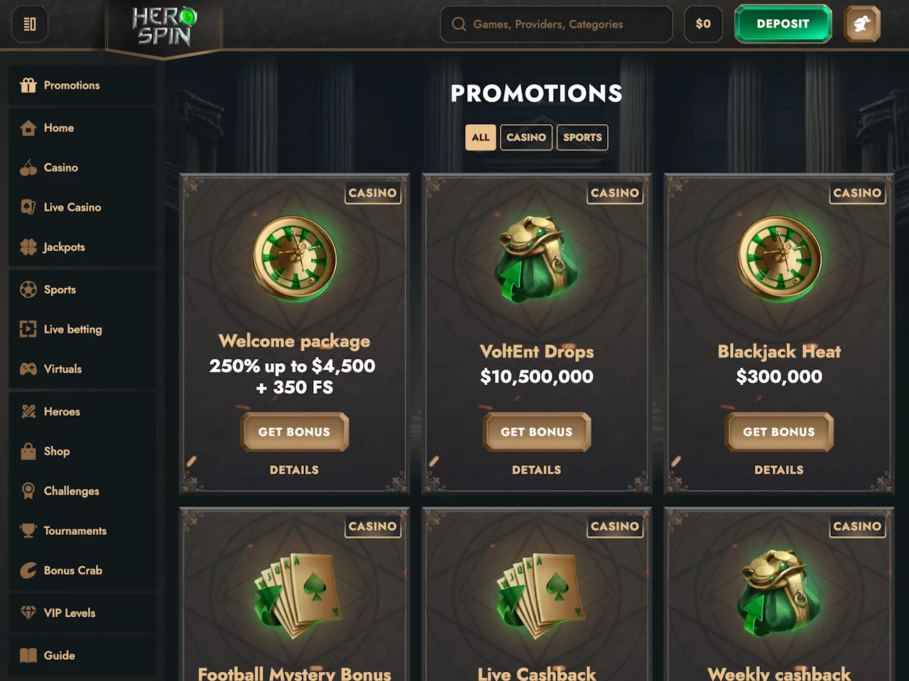 Beyond the advertised Welcome Bonus (250% match up to $4,500 with 350 Free Spins), the platform’s recurring promotions carry more variety. Weekly cashback offers reach up to 15% (capped at $4,500), with a separate live casino cashback of 25% up to $300. Players can also claim 50 Free Spins via the Weekly Reload. Blackjack Heat offers a $300,000 prize pool, while the Football Mystery Bonus lists a $90,000 cap. Beyond these offers, HeroSpin’s promotional system is also built around coins, weekly quests, and a gamified hero feature. Players earn coins by placing bets, completing challenges, or participating in tournaments. These coins can be exchanged for bonus money, free bets, or hero unlocks.