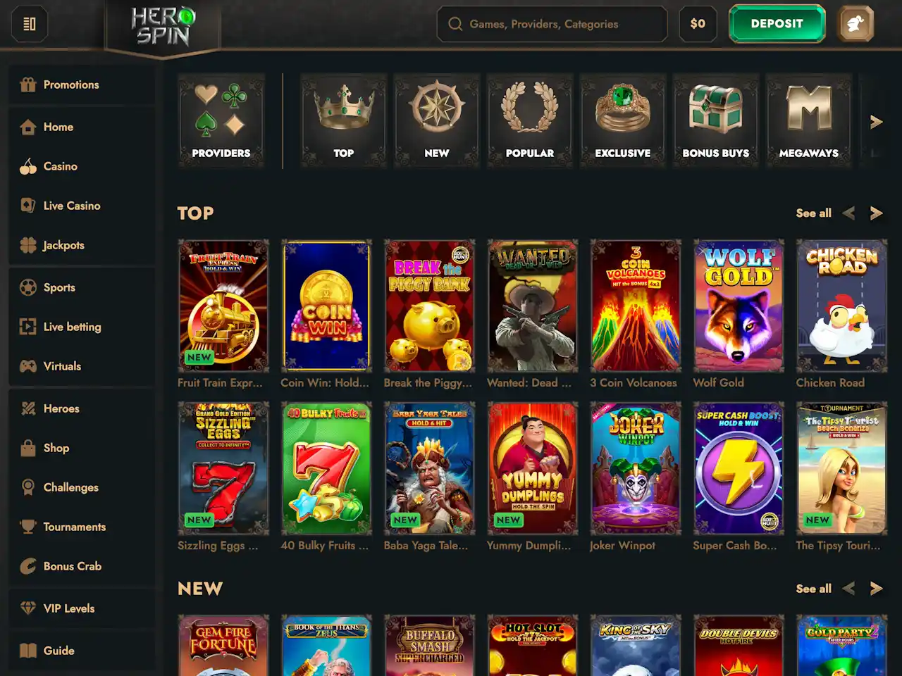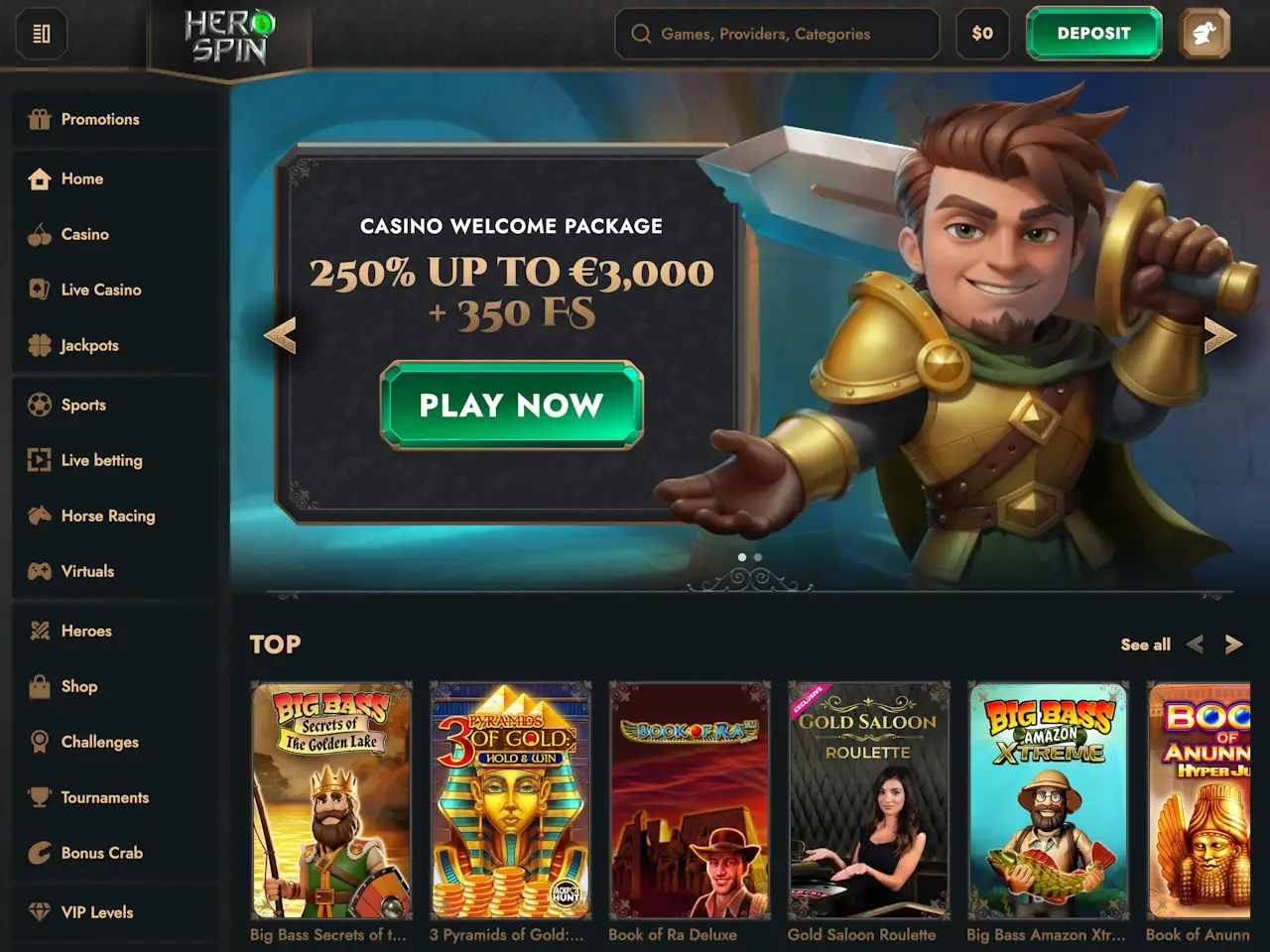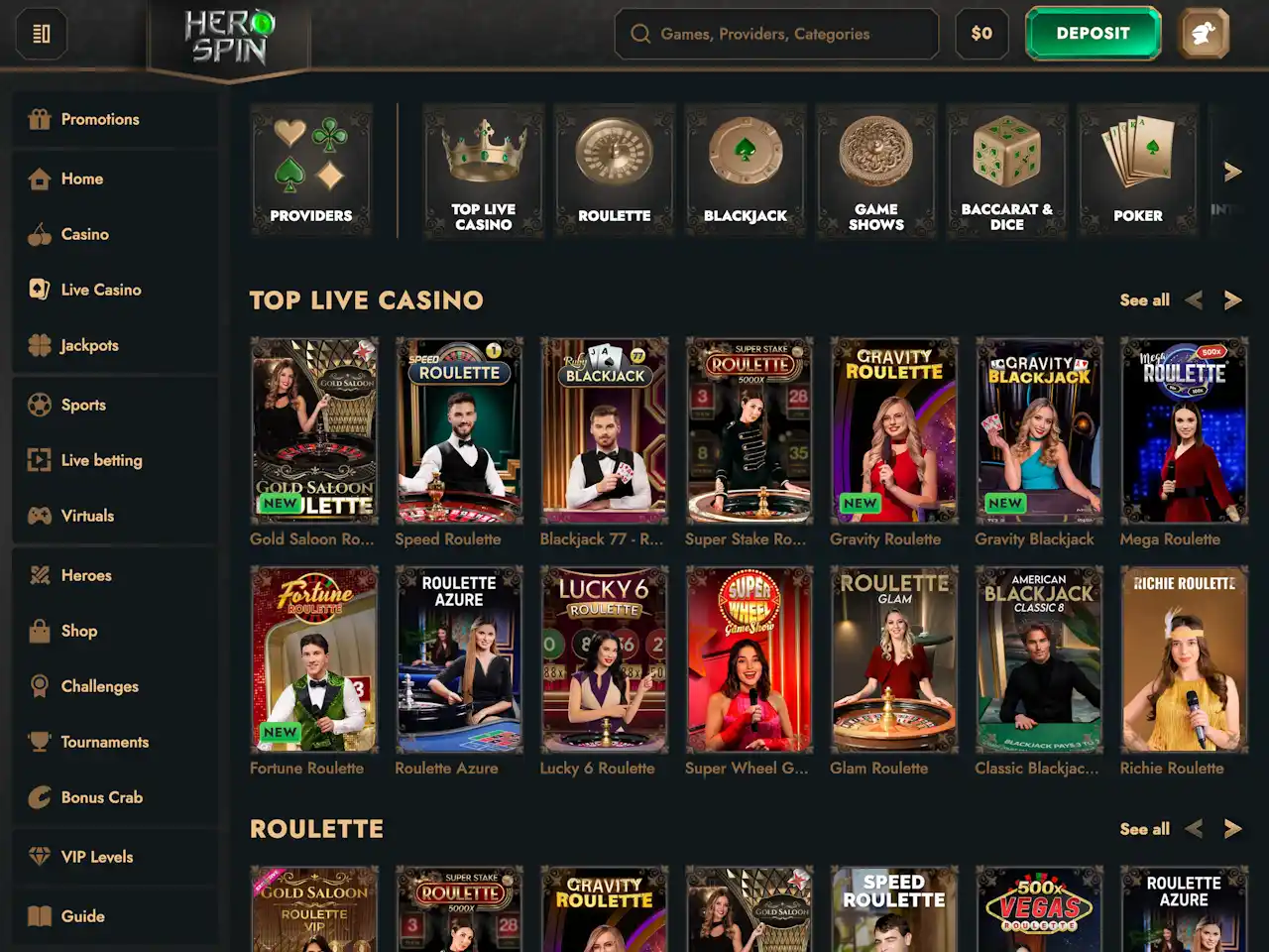 HeroSpin Casino offers access to more than 13,000 games, including 750+ live dealer titles. The platform supports categories such as Megaways, Exclusive, and Bonus Buy, each clearly labelled in the game lobby. Pokies players will find a huge range of titles, alongside roulette, blackjack, video poker, keno, and scratch cards. The provider list is extensive as well. Also, there’s no option to sort by RTP, which some players might expect at this level of game volume.