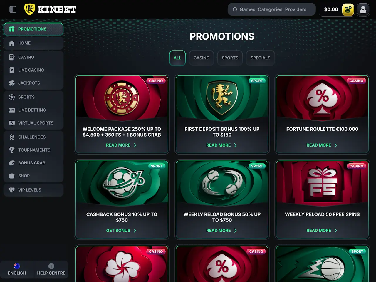 To find bonus Terms & Conditions at Kinbet you need to go to the Help Centre and locate the Promotions tab. There, you will find explanations for all bonuses available at the casino.