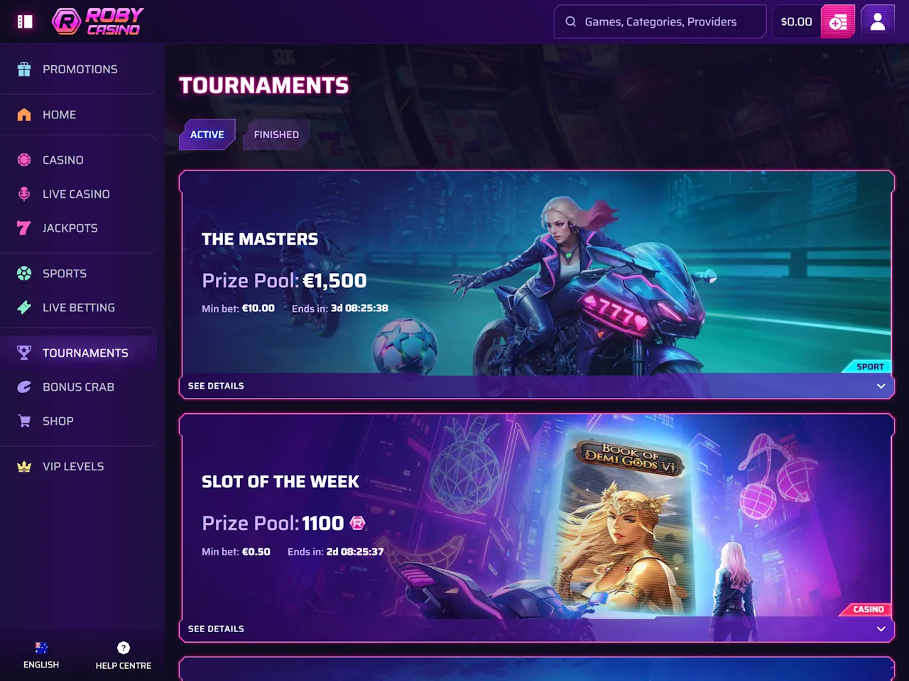 Roby offers numerous bonuses beyond the welcome promo. You can utilise reload bonuses, cashback promotions, and weekly free spins for different game preferences. Also, sports enthusiasts can use separate bonuses, including a first deposit bonus, cashback, weekly reloads, accumulator boost, and more. Beyond standard bonuses, the Bonus Crab promotion enables players to claim daily rewards for deposits. Bonus Shop is also available and allows players to trade casino coins for free spins, bonus money, free bets, and Bonus Crab rounds. In order to accrue casino coins, you need to deposit, bet, and participate in tournaments. As an example, for every $160 wagered on a casino site, you'll receive one coin, plus 5% of every deposit you make will be added to your coins balance.