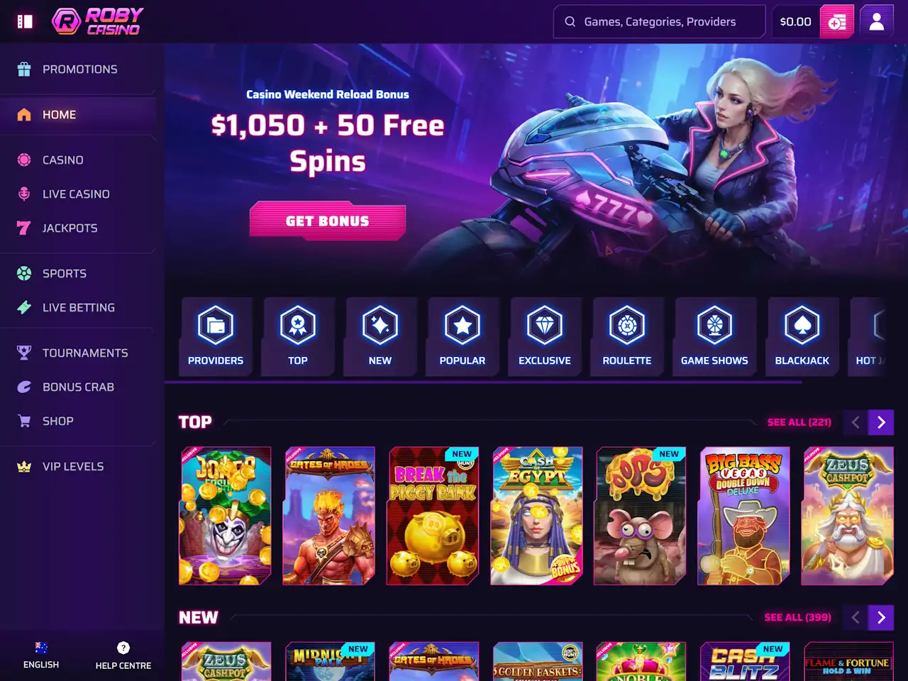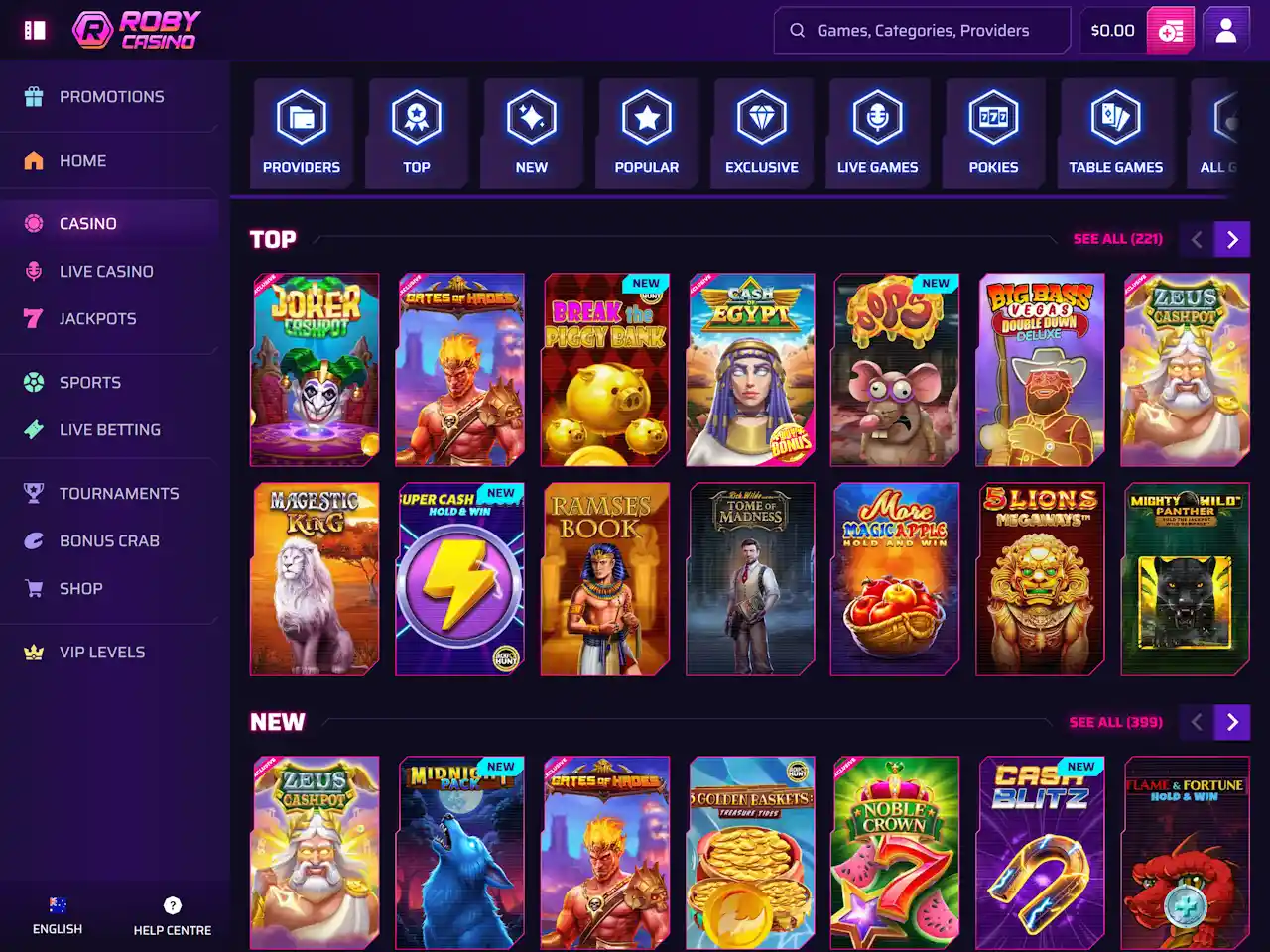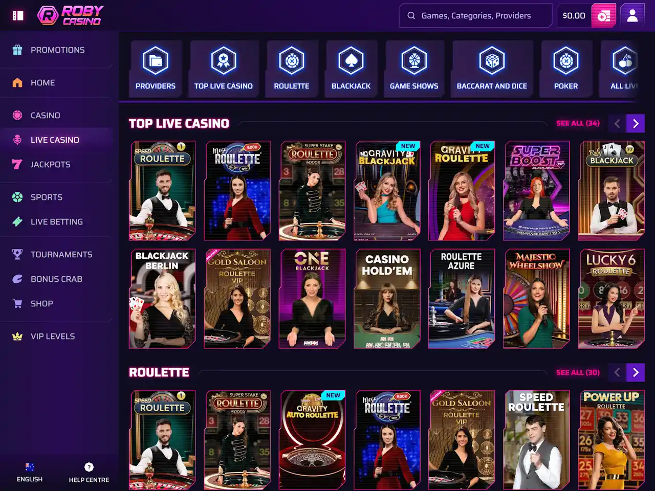 Roby Casino has 8,000+ games that are supplied by tens of providers. A few examples are pokies, video poker, table games, and a few more. Live dealers constitute about 300 titles of blackjack, roulette, baccarat, dice, game shows, and poker. Roby has some exclusive titles that are inimitable to this gambling website.