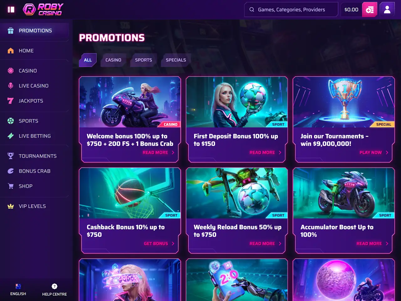 Roby offers a structured VIP program with five distinct levels. Players progress through these tiers by earning coins from real money bets, though the exact requirements for levelling up are not specified on the website. Benefits start modestly but increase significantly from the third VIP level onward, including exclusive bonuses, faster withdrawals, and dedicated account managers. This tiered system rewards ongoing play, encouraging Aussie players to stay engaged while enjoying increasing benefits as they advance.
