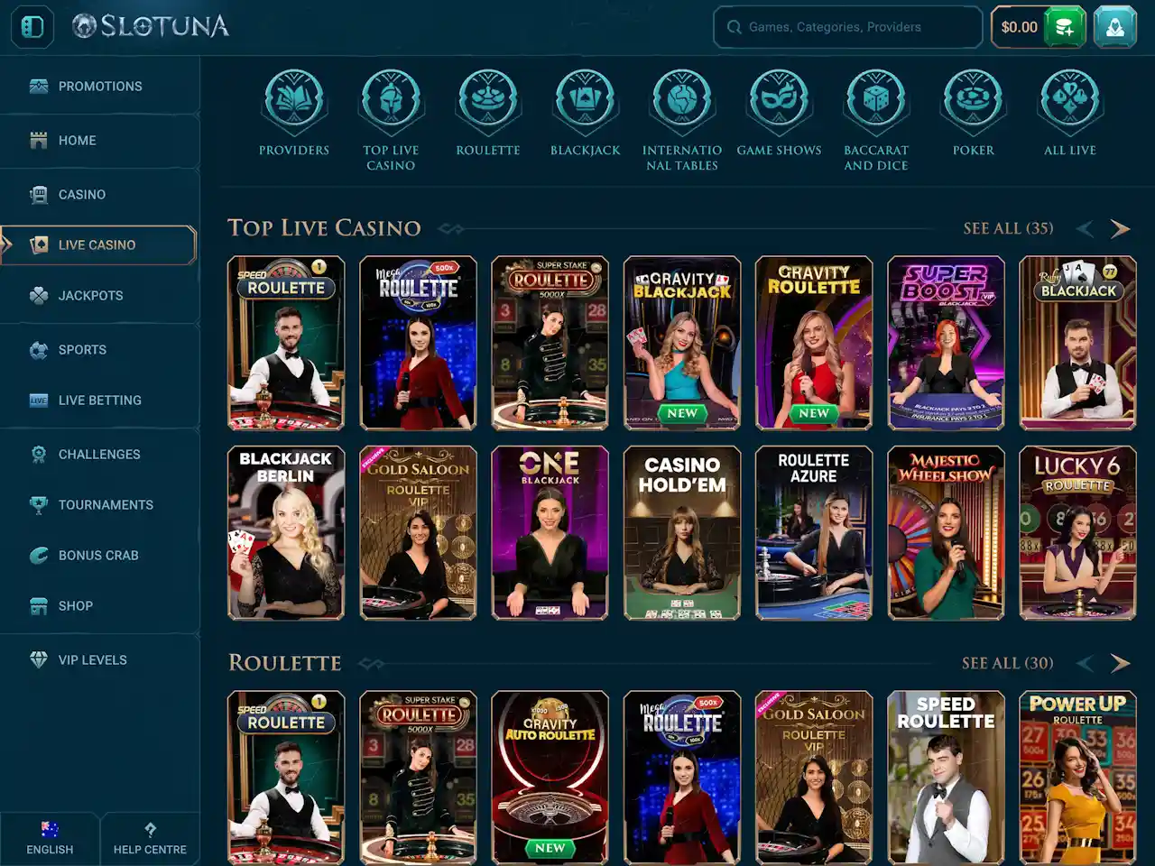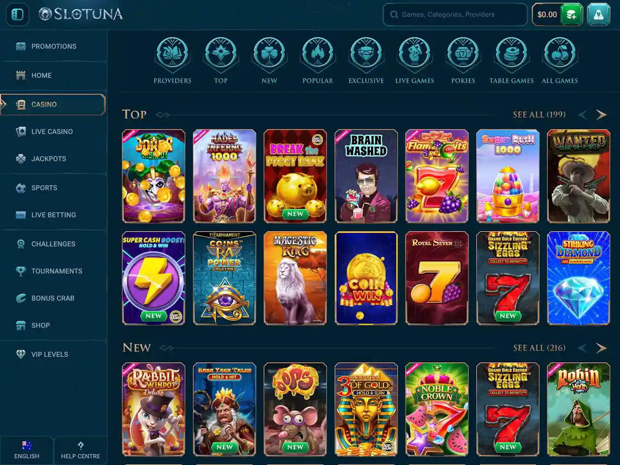 Slotuna offers a sprawling mix of pokies, table games, and exclusive options, with over 400 live casino tables — more than many other platforms Aussies might be used to. Blackjack, roulette, baccarat, keno, video poker, and even bingo are all represented. Pokies are the most popular game at Slotuna, featuring multiple types, including fruit pokies, Megaways, progressive jackpots, and titles with many other features. Navigation on the site clearly separates new, top, and popular picks.