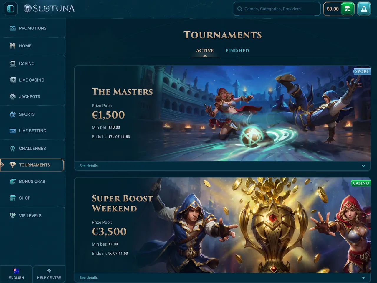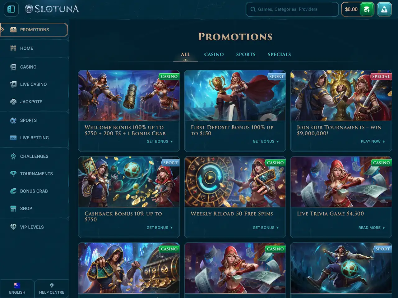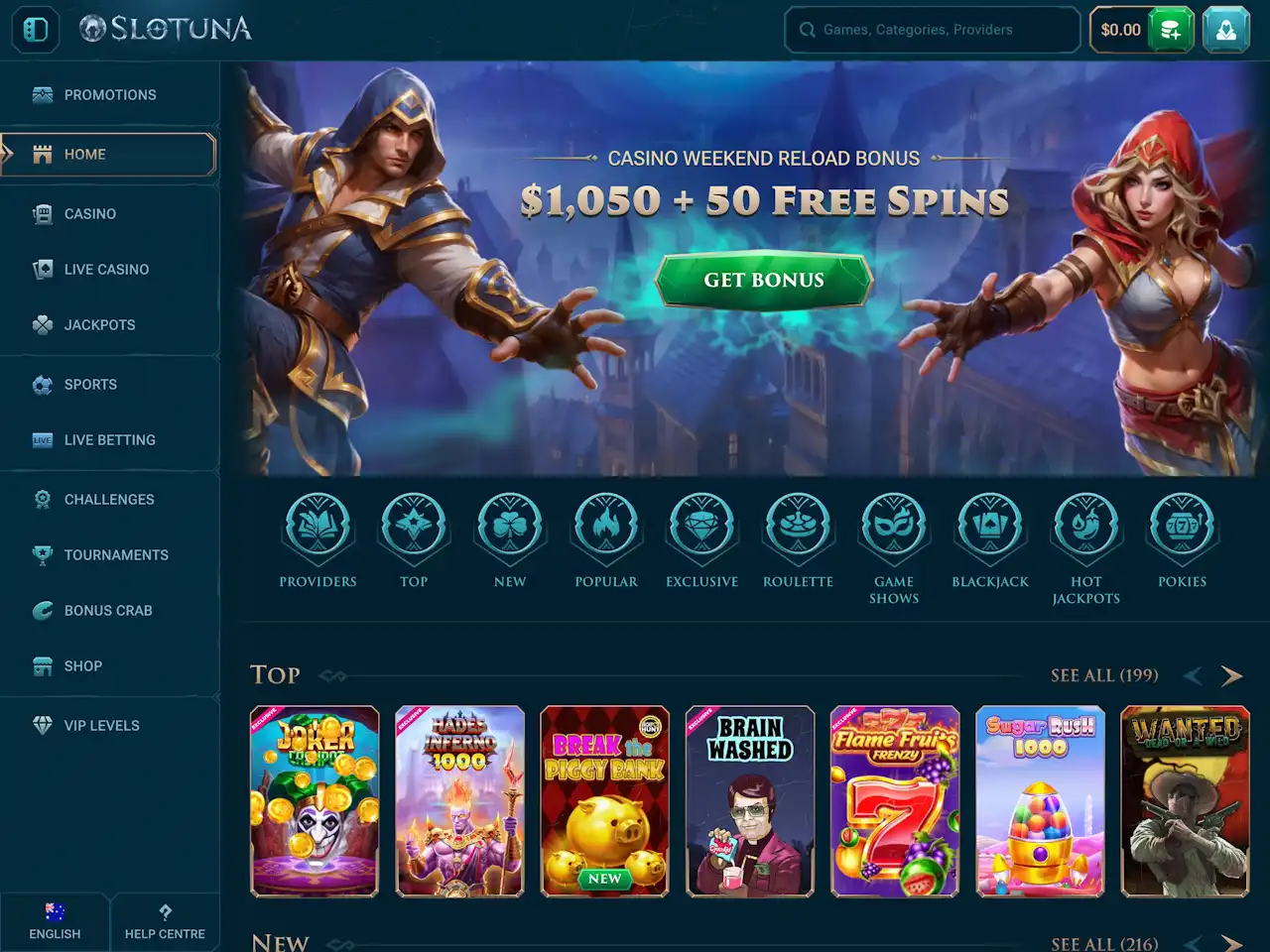 Slotuna loads quickly and greets you with a vibrant fantasy-themed design featuring heroic characters. On the main page, you can see a promo banner and a slide-out navigation menu on your left. Below the banner, categories like top games, new releases, and exclusives help you find your favorites quickly. The top right has a search bar, balance, and account buttons, while language and support options sit at the sidebar’s bottom. Overall, the site is visually appealing and simple to navigate, with all key features easily accessible.
