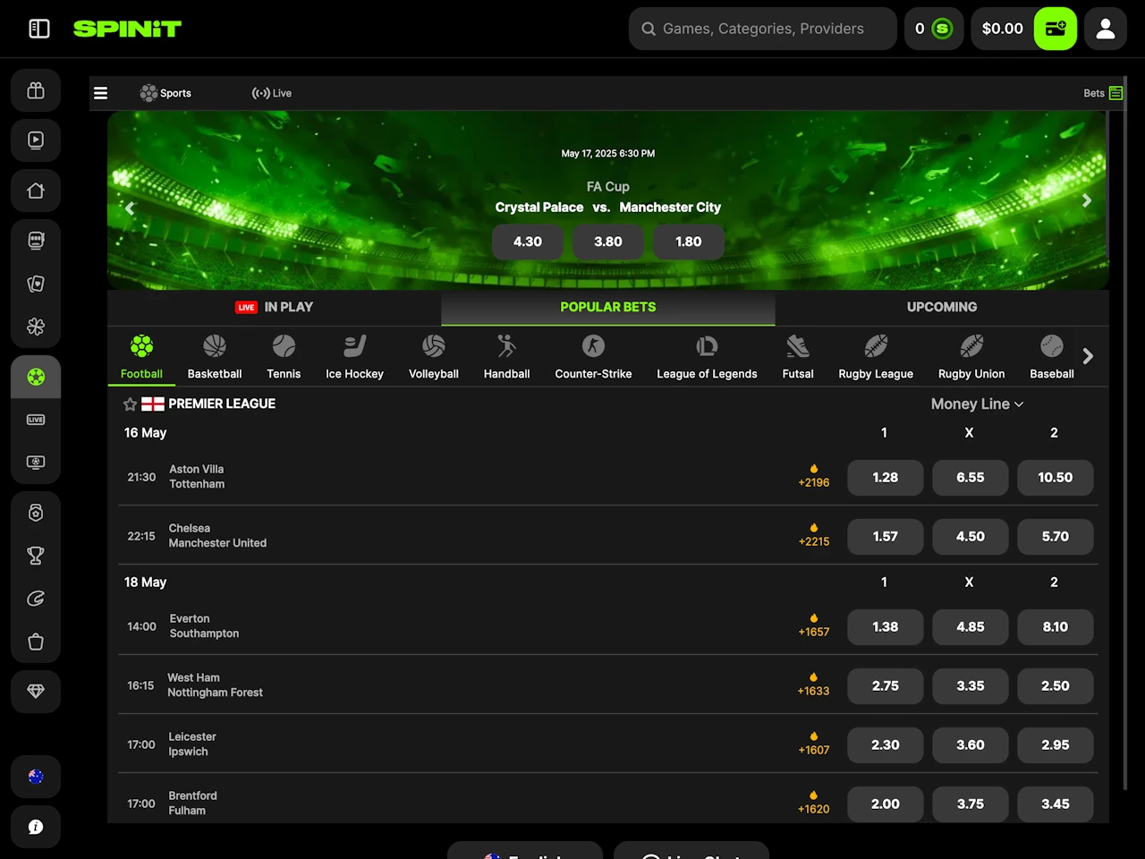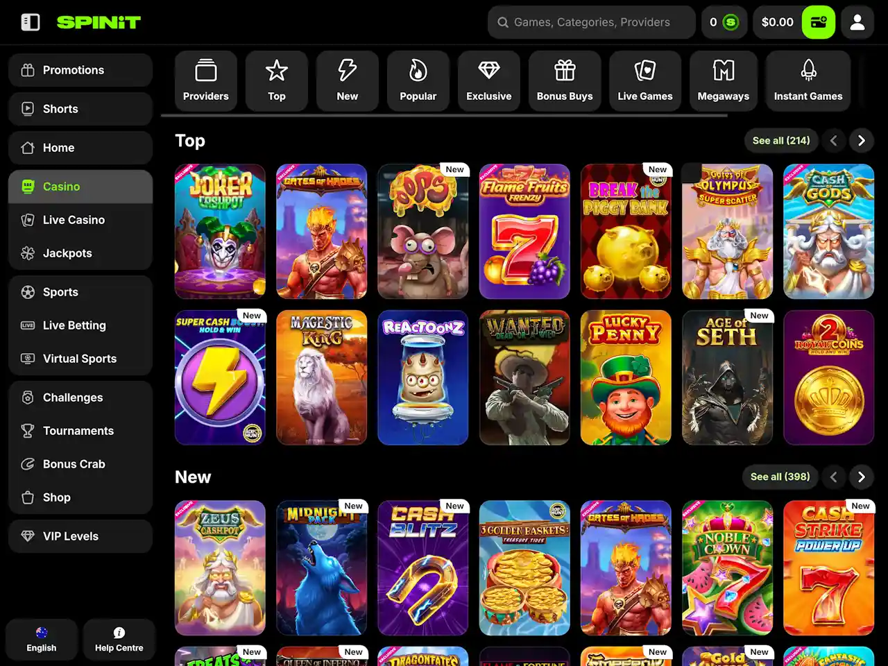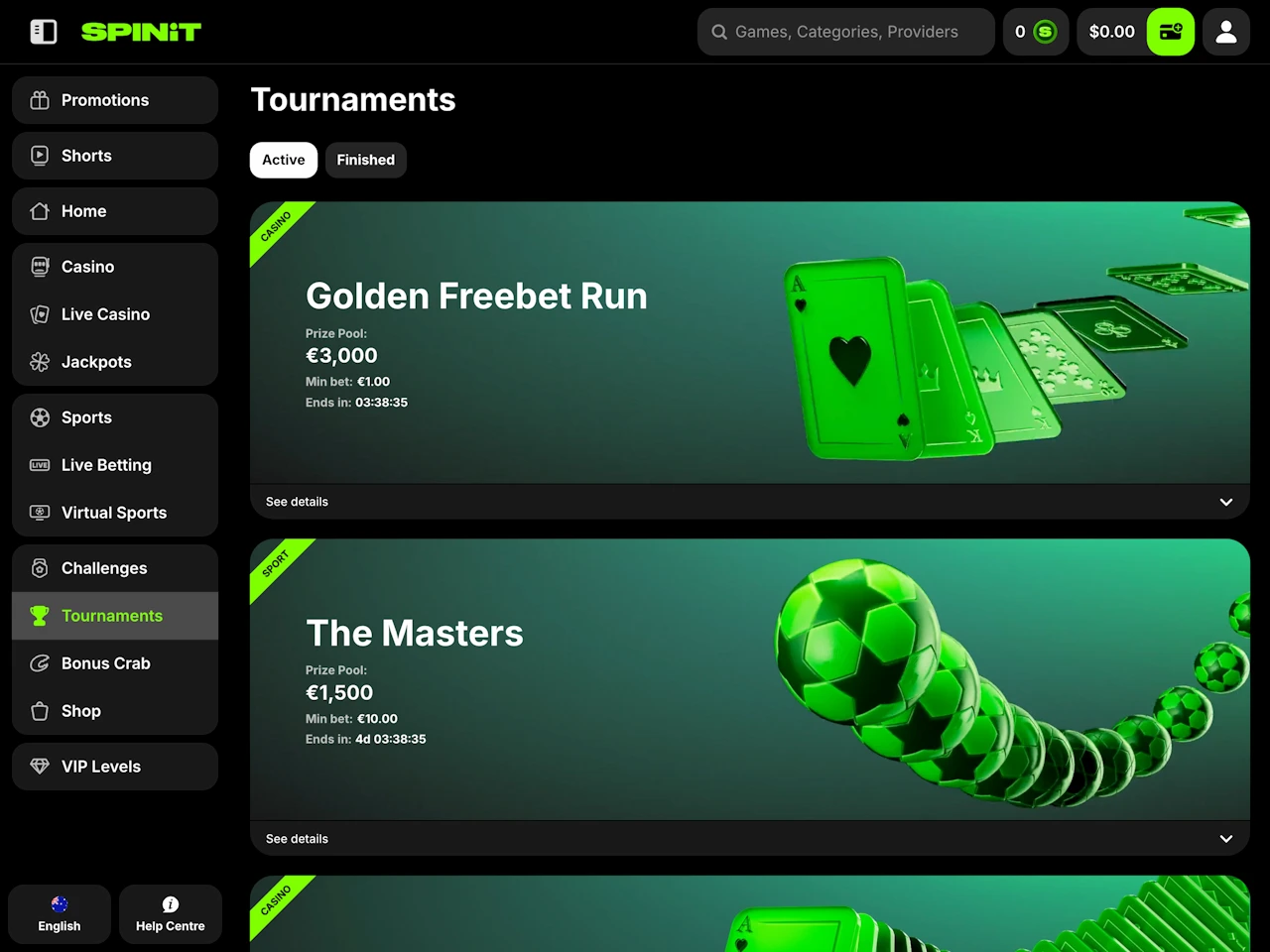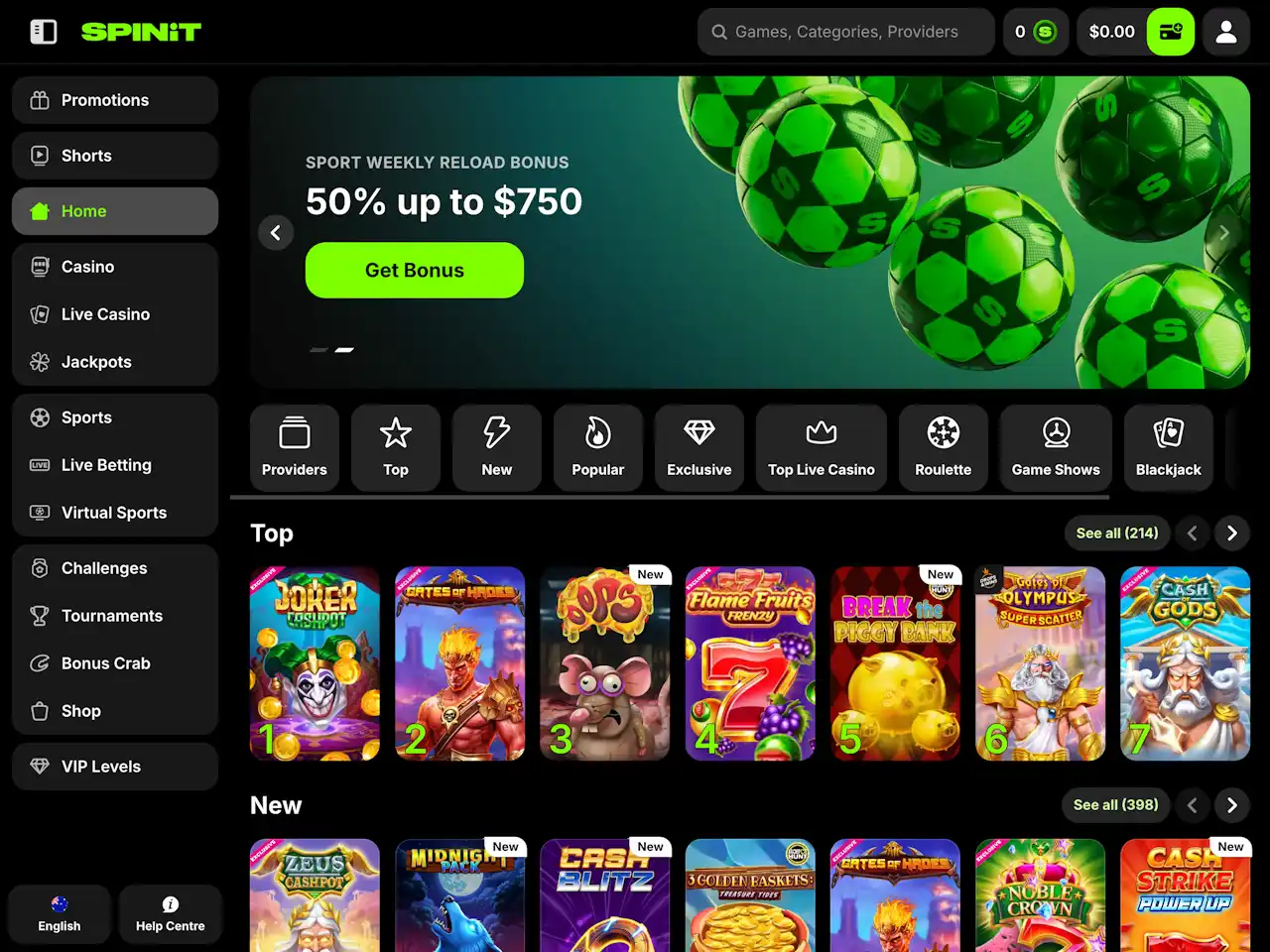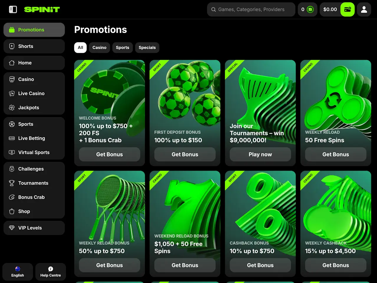 Spinit Casino features a sleek, energetic design with vibrant green tones and dynamic 3D graphics that give the site a fresh, modern appearance. The layout is user-friendly, with quick access to games directly from the main page. A side menu on the left allows players to easily navigate to sections like Promotions, Tournaments, Sports, Live Casino, and more. Customer support can be reached via the help icon in the bottom-left corner. To view important information such as Terms and Conditions for bonuses or payments, just scroll to the bottom of the page.