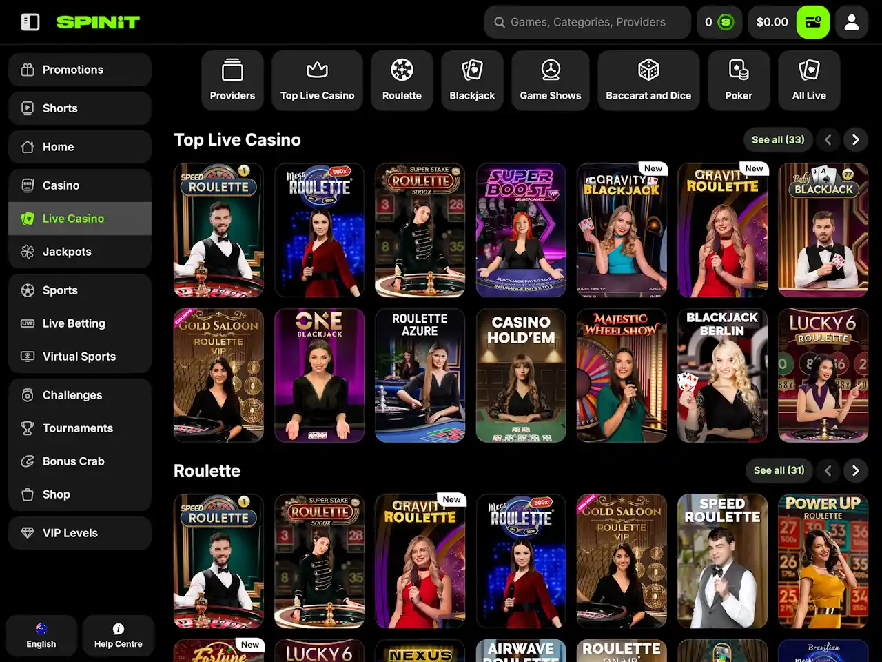 The choice of games at Spinit is quite wide, since the casino offers different types of games, including pokies, table games, e.g., poker, baccarat, blackjack, keno, bingo, etc., live dealer games, and many others. Pokies at the casino range from classic 3-reel to modern video pokies, featuring mechanics like Megaways and grid layouts. Also, the casino offers progressive jackpots and crypto games that even have their own sections on the casino’s page. For sports betting enthusiasts, Spinit also has a lot of options, offering betting on such games as tennis, basketball, soccer, rugby, and other types of sports.