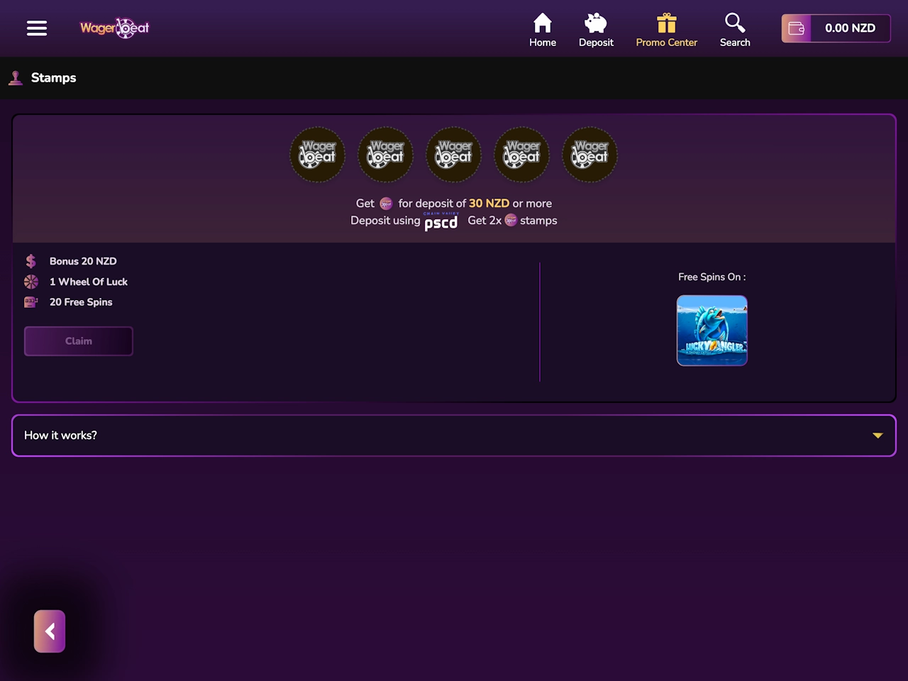 The Promo Centre at Wager Beat Casino grants access to daily rewards, the Perks program, deposit bonuses, free spins, and Stamp Collections. Stamps are awarded to all players who deposit at least $30 and can later be traded for a range of benefits, including free spins, cash bonuses, and more. The Wheel of Luck becomes available for spinning two hours after each deposit, offering chances to win bonus free spins, no-wagering cash prizes, additional Wheel of Luck spins, and other rewards. Each bonus is provided separately, but players are encouraged to read the general Terms and Conditions of the casino to fully understand the details of each promotion. The wagering requirements are x35 for bonuses and x50 for free spin winnings, which are relatively high and may be challenging to meet.