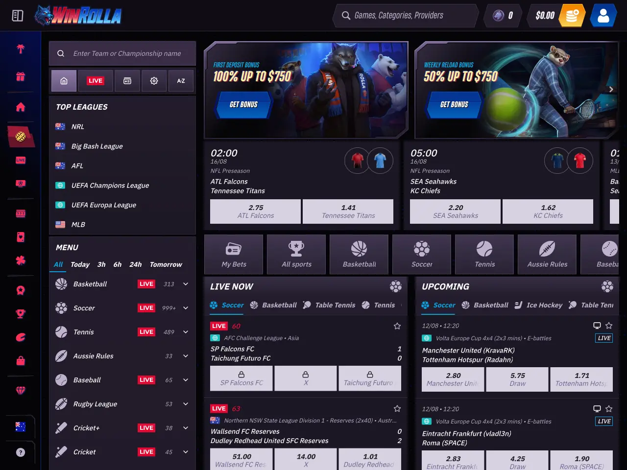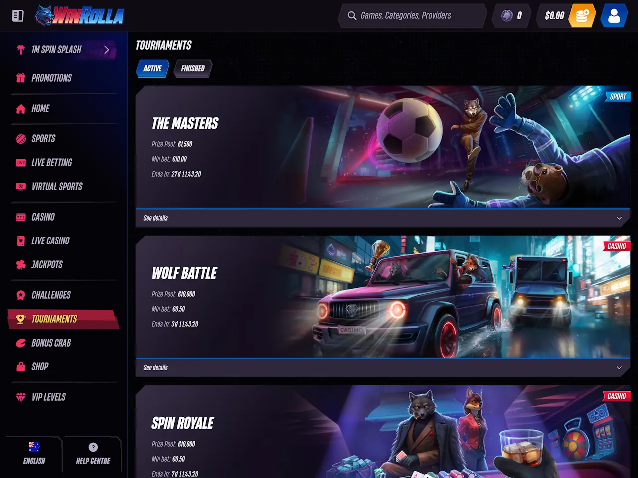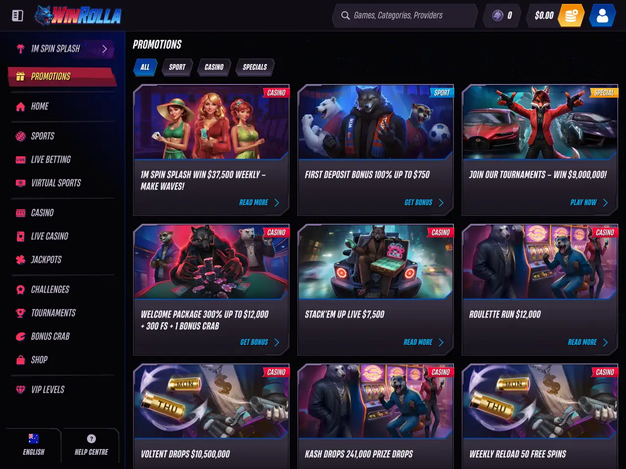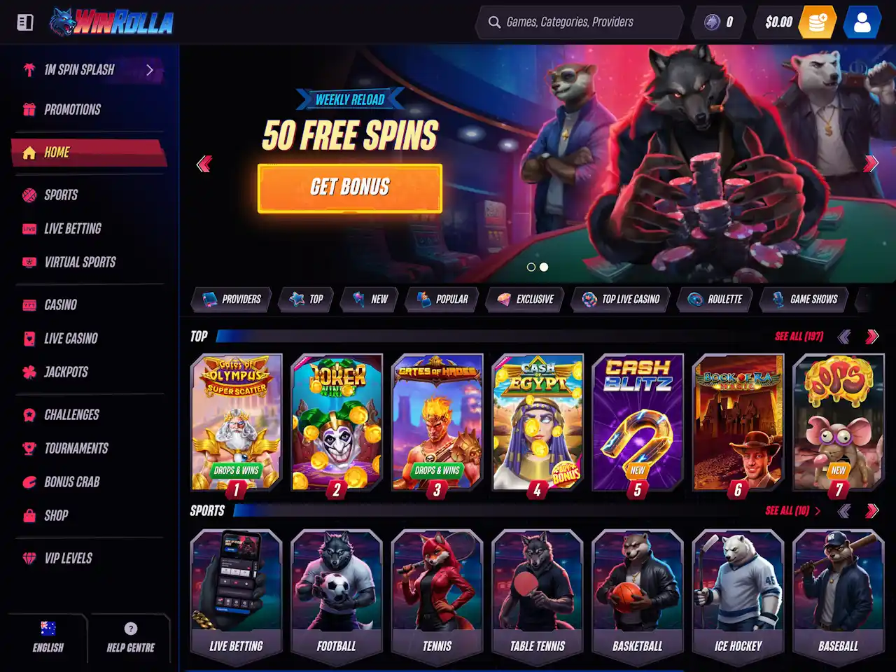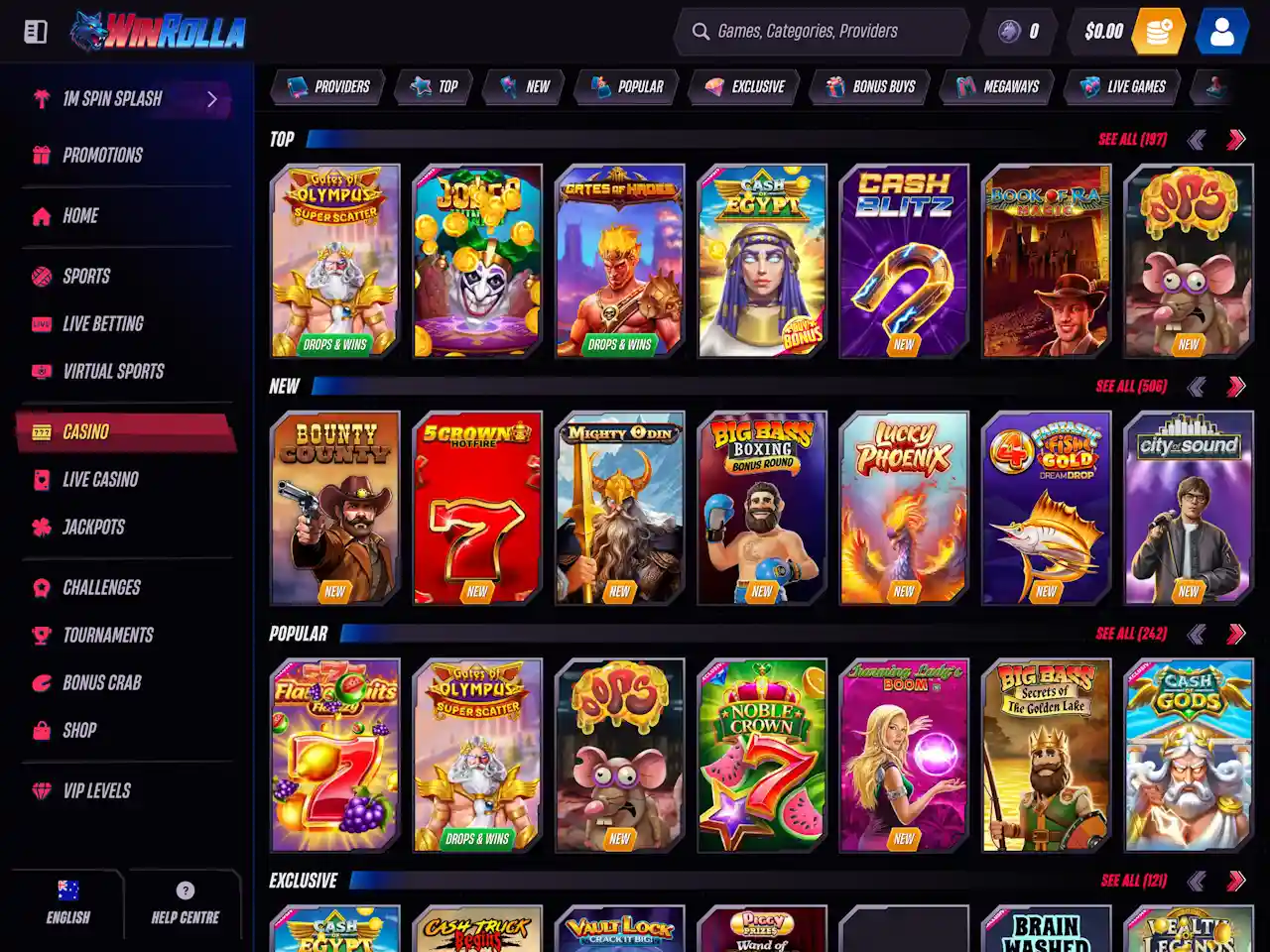 Win Rolla Casino presents a sleek, modern interface with a dark-toned background accented by vibrant, neon-style highlights. The homepage features rotating promotional banners and illustrated characters, giving it a distinctive, themed style. Game categories are prominently displayed with clear, clickable buttons for quick access, including Top, New, Popular, and Exclusive titles. Navigation is intuitive, with filters for providers and game types, ensuring players can quickly find what they’re looking for. The layout balances visual appeal with usability, avoiding clutter while showcasing both casino and live dealer sections, as well as clear links to sports betting and promotions.