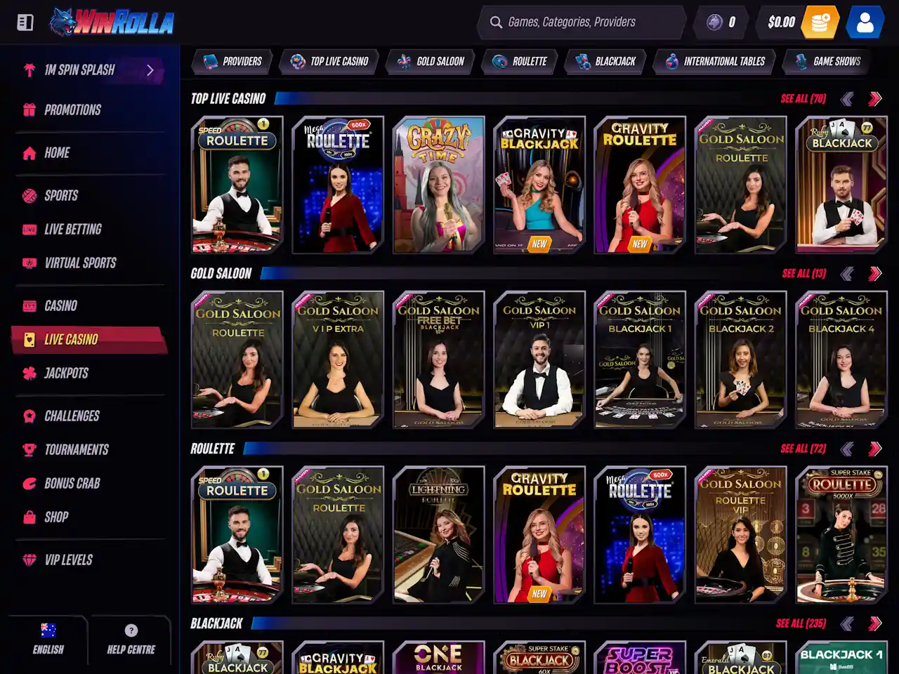 Win Rolla features more than 17,500 games, including 750+ live dealer tables, progressive jackpots, Megaways slots, instant wins, and exclusive titles. The library is neatly organised with filters, search tools, and categories to help players find favourites quickly.